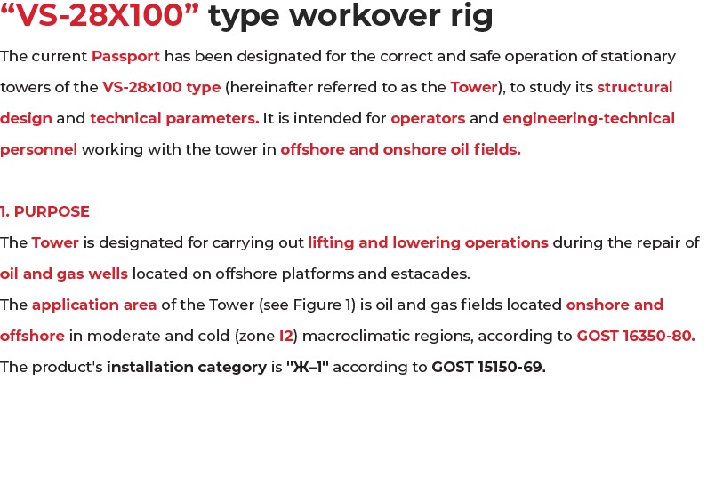 The application area of the Tower (see Figure 1) is oil and gas fields located onshore and offshore in moderate and cold (zone I2) macroclimatic regions, according to GOST 16350-80.